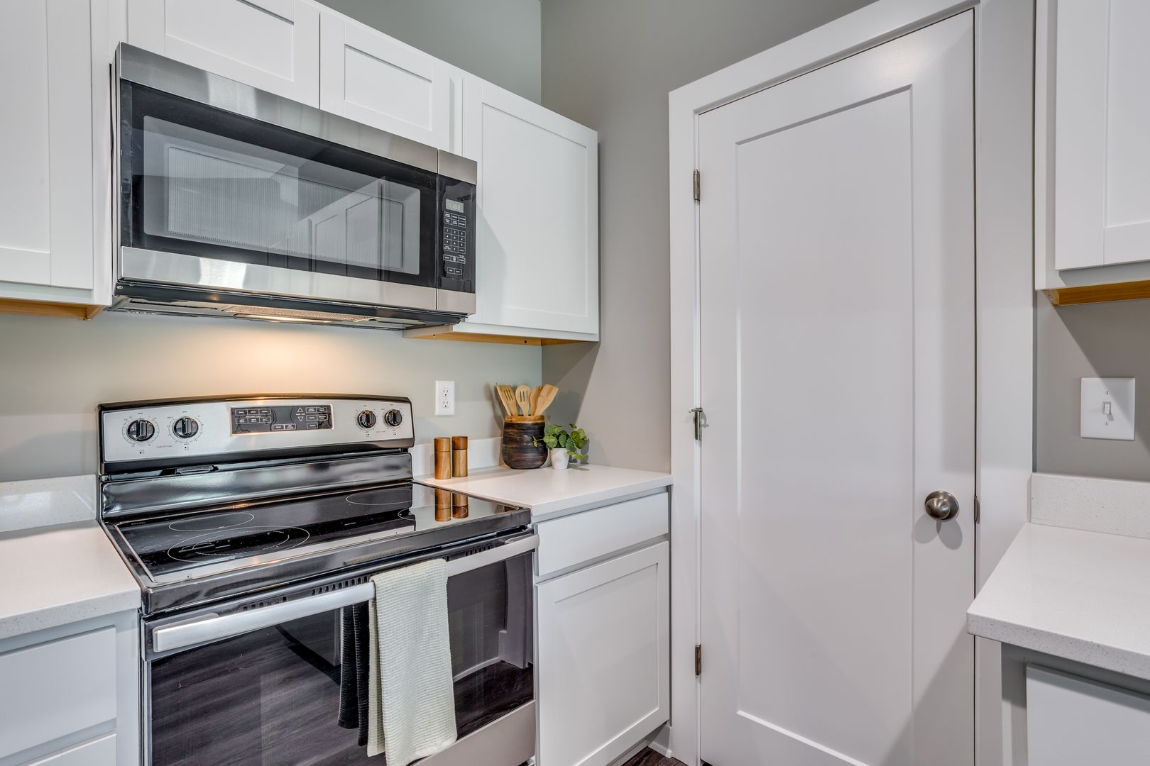 Full stainless steel appliance package (side-by-side fridge with ice & water, range, dishwasher, microwave)